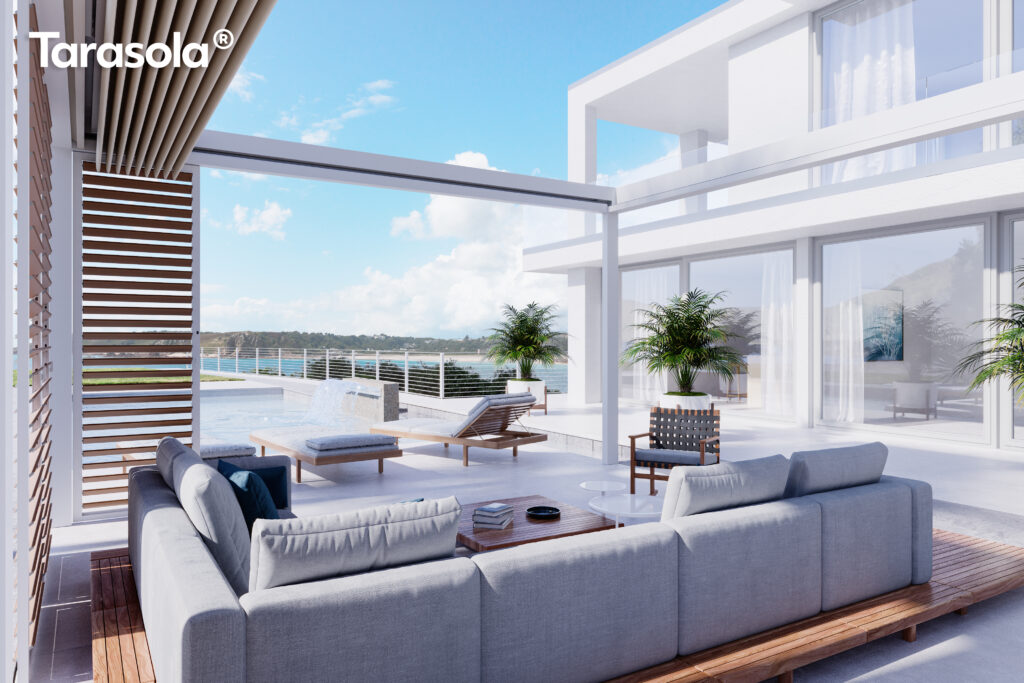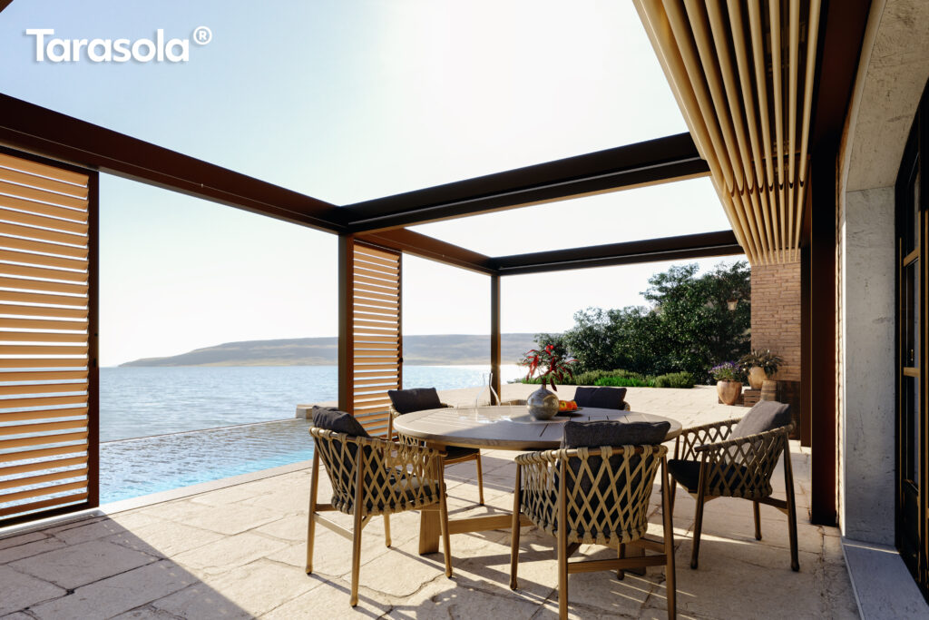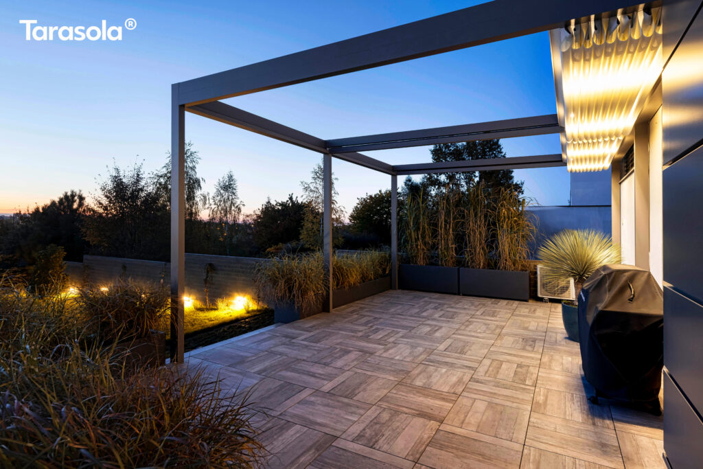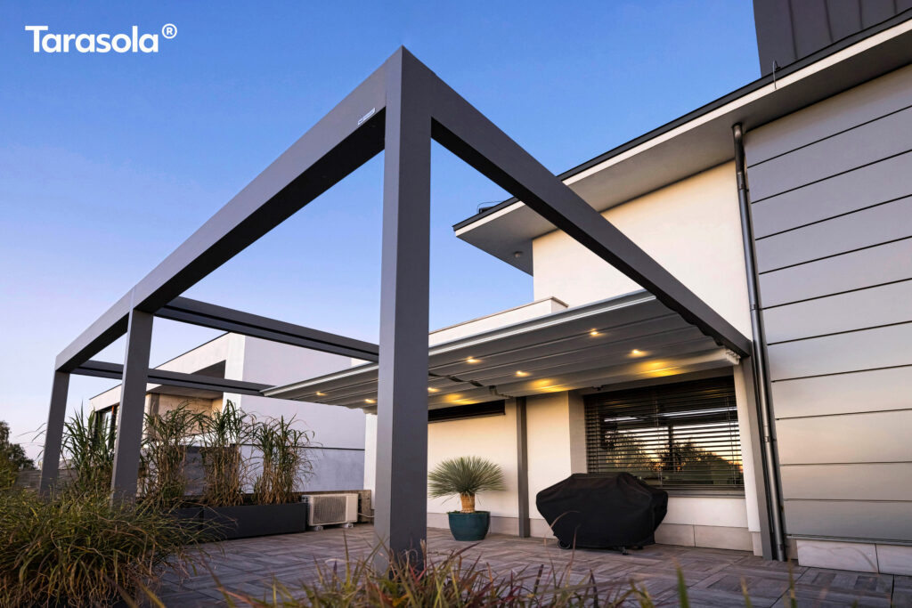 Górna warstwa ma na celu skuteczną ochronę, dolna zapewnia estetyczne wykończenie. Obie warstwy można otworzyć, aby cieszyć się nieograniczoną przestrzenią. Prosta, kubiczna forma świetnie wpisuje się w nowoczesny styl architektoniczny, a możliwość rozbudowy modułowej odpowiada na potrzeby branży HoReCa. Sprawdzi się jako pawilon w ogrodzie, przedłużenie domowego salonu czy zadaszenie w opasce betonowej.