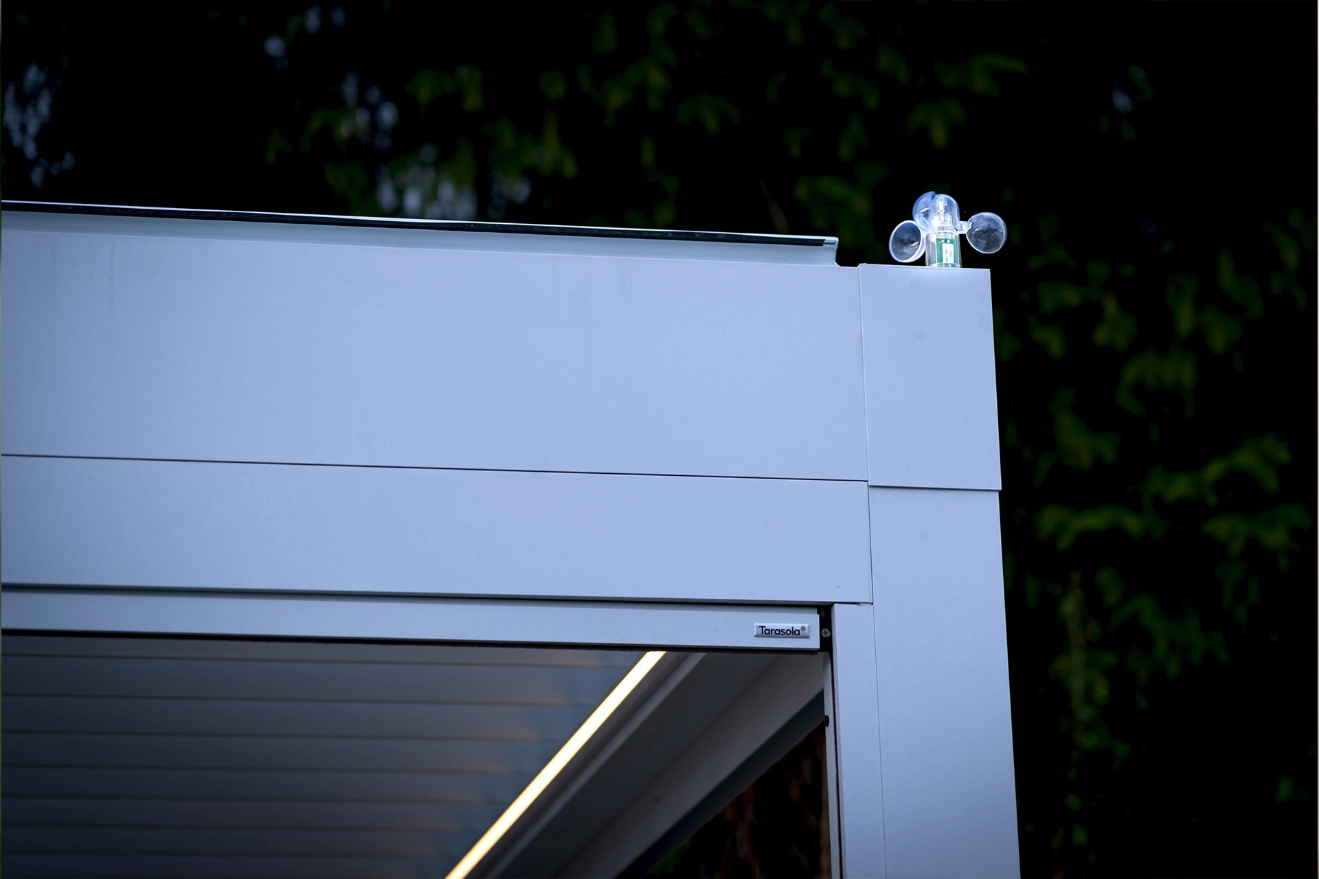 Czujniki pogodowe zapewniają wygodę oraz bezpieczeństwo. Czujnik deszczu, wiatru oraz śniegu w razie niekorzystnych warunków przesyła sygnał, dzięki czemu dach i/lub rolety przeciwwietrzne typu Screen zareagują automatycznie chroniąc Ciebie, Twoich bliskich, meble, kwiaty oraz inne akcesoria na tarasie. Tarasola wyposażona w czujniki pogodowe to inteligentna technologia reagująca na zmienne warunki atmosferyczne.