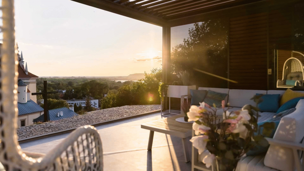 Połączenie dachu lamelowego z dachem szklanym to bardzo funkcjonalne rozwiązanie. Łączy ono zalety otwieranego dachu z aluminium, ze szklanym dachem stałym. Dach szklany to maksymalny dostęp do naturalnego światła, który chroni przed opadami, jednak nie zacienia powierzchni. Pozwala doświetlić tą część tarasu, na której nam zależy. Dach lamelowy zapewnia cyrkulację powietrza i pozwala regulować stopień nasłonecznienia. Lamele w pozycji zamkniętej chronią przed deszczem i w pełni zacieniają taras.