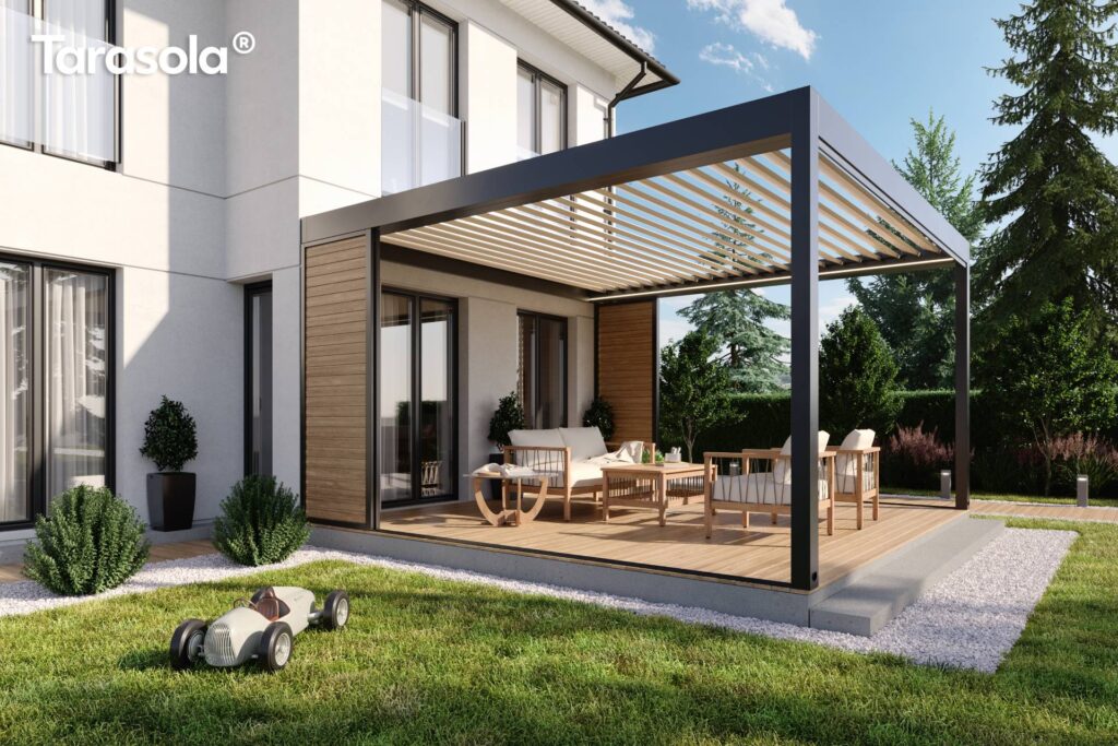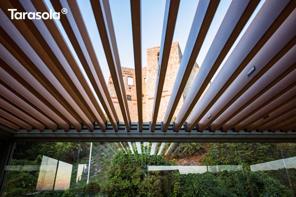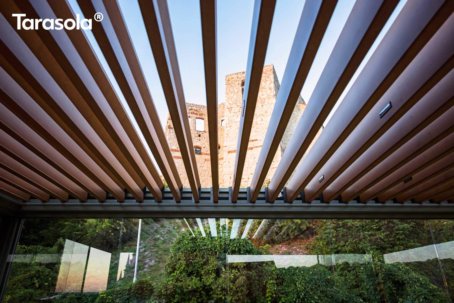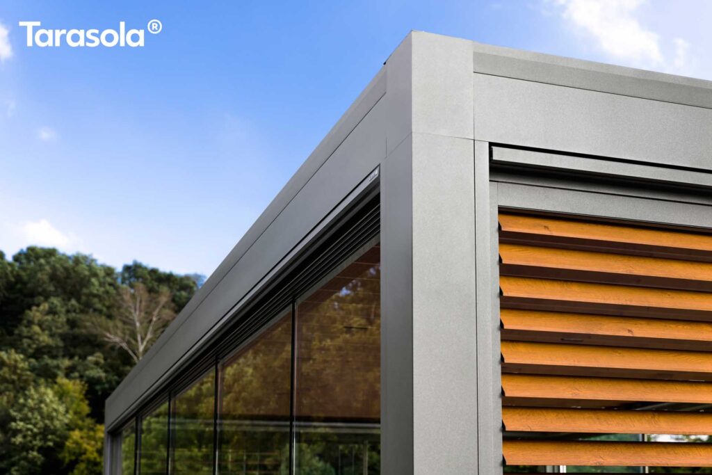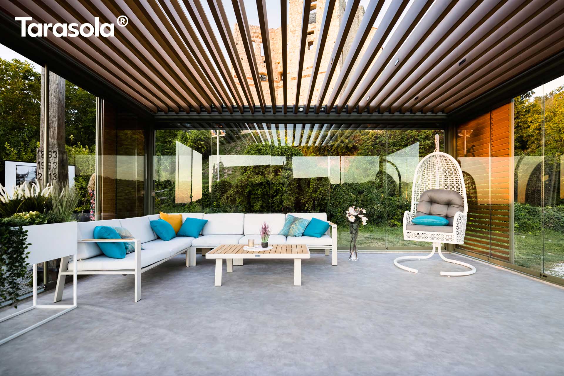 Tarasola Technic Pro wyróżnia się spośród innych modeli zintegrowaną roletą ZIP. Brak dodatkowej kasety na roletę sprawia, że konstrukcja wygląda bardzo elegancko i nowocześnie. Zadaszenie pozwala na regulację nachylenia lameli i dostosowanie do osobistych preferencji. W pozycji zamkniętej dach chroni przed słońcem, deszczem oraz śniegiem, w pozycji otwartej dozuje ilość światła wpadającego na taras oraz zapewnia naturalną wentylację.