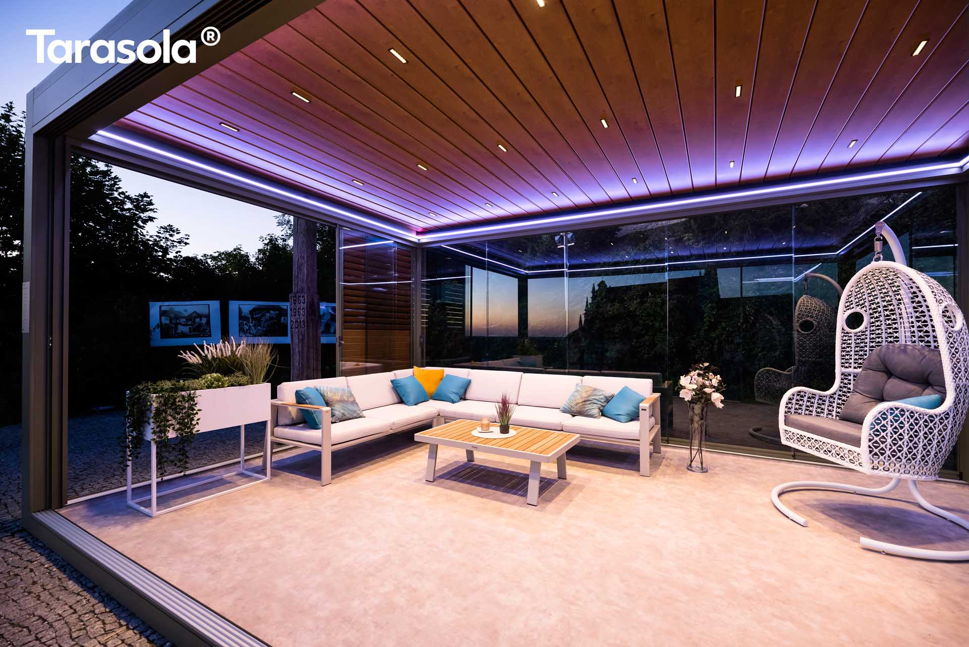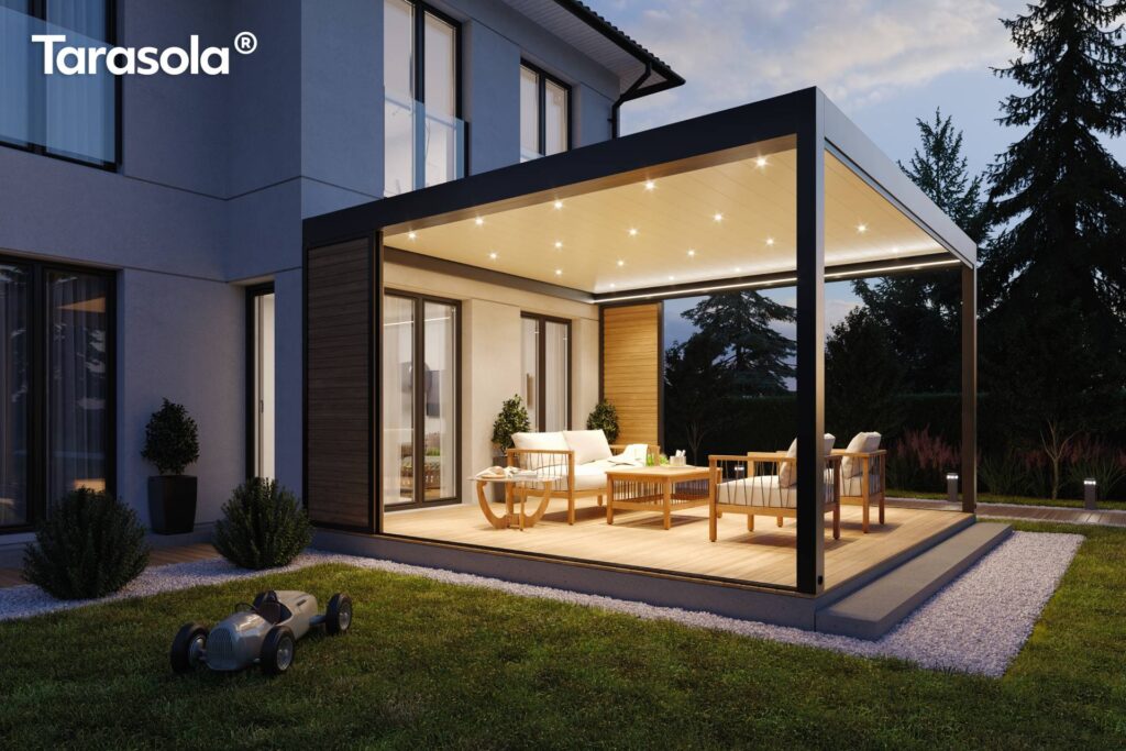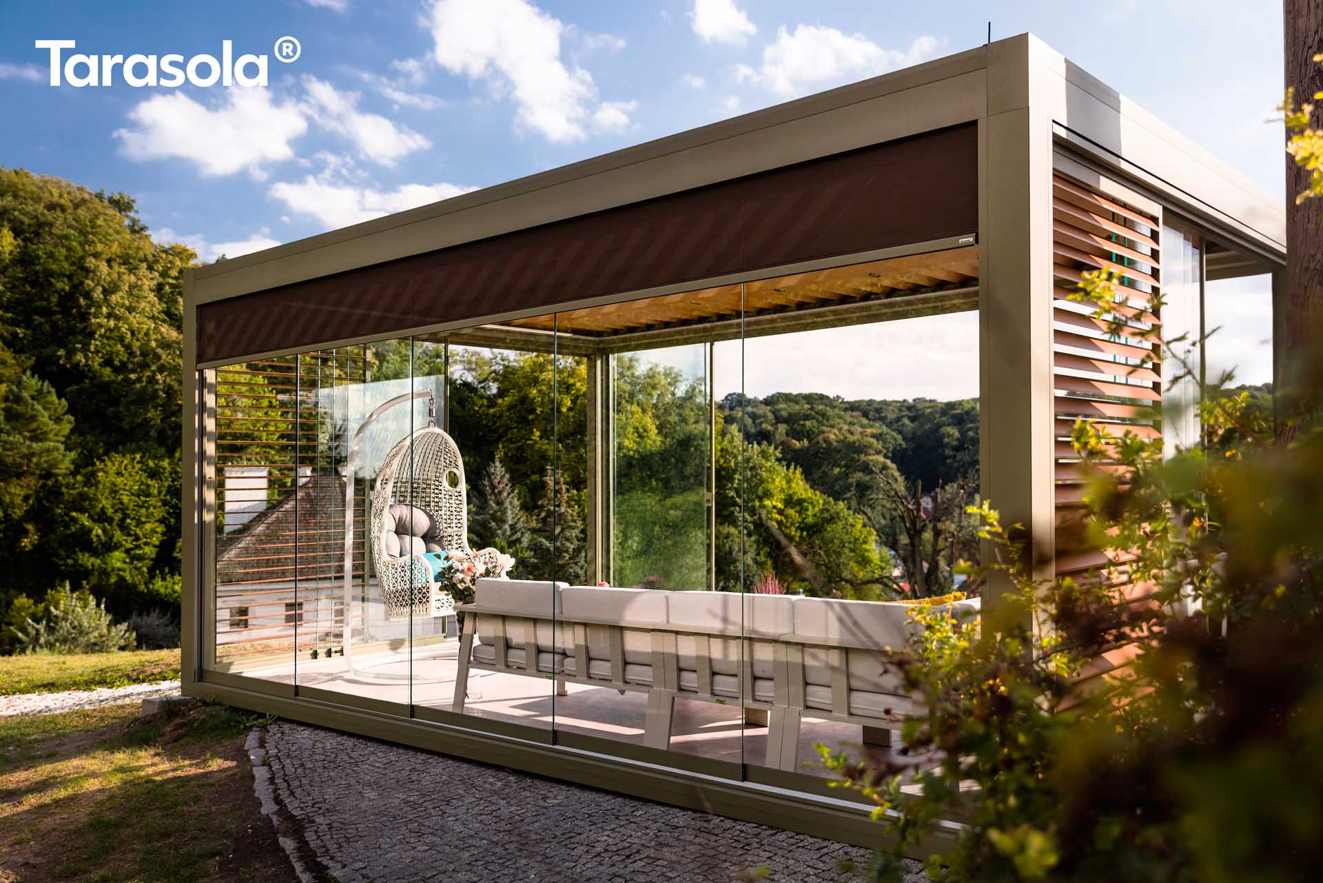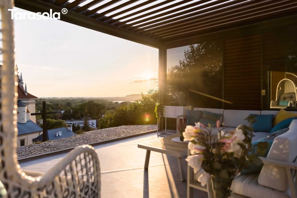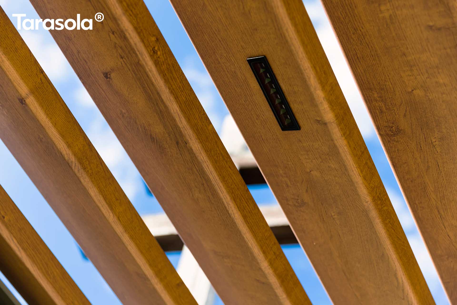 Tarasola Technic Pro wyróżnia się spośród innych modeli zintegrowaną roletą ZIP. Brak dodatkowej kasety na roletę sprawia, że konstrukcja wygląda bardzo elegancko i nowocześnie. Zadaszenie pozwala na regulację nachylenia lameli i dostosowanie do osobistych preferencji. W pozycji zamkniętej dach chroni przed słońcem, deszczem oraz śniegiem, w pozycji otwartej dozuje ilość światła wpadającego na taras oraz zapewnia naturalną wentylację.