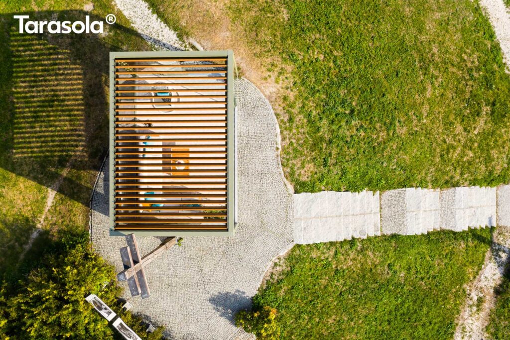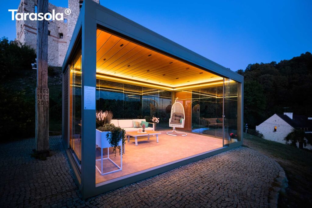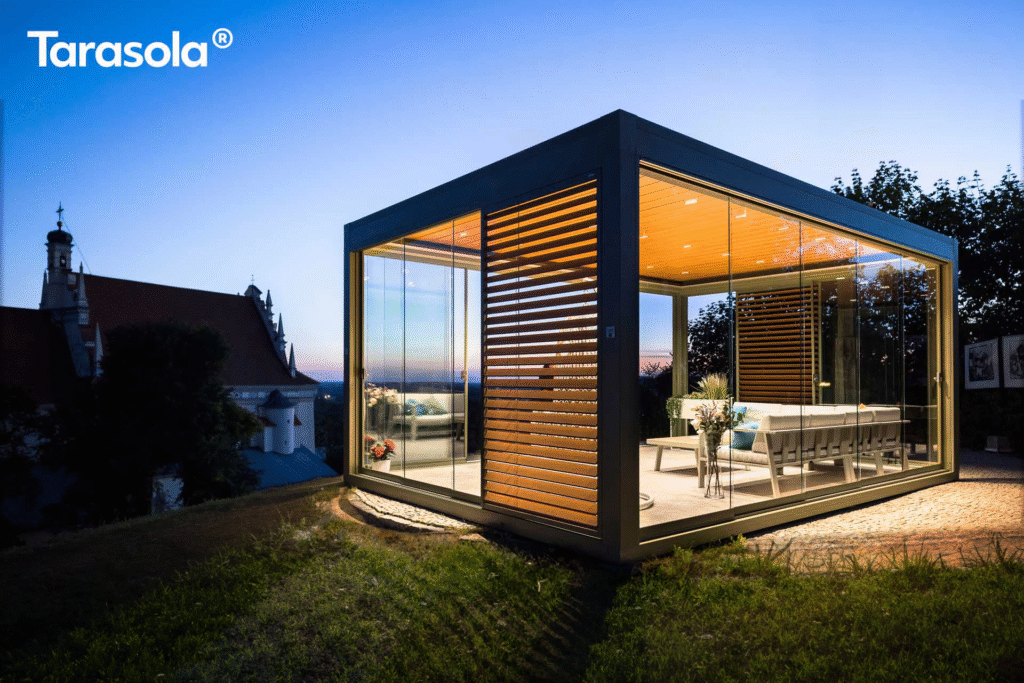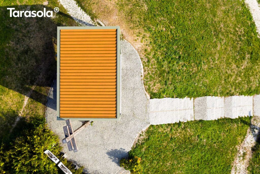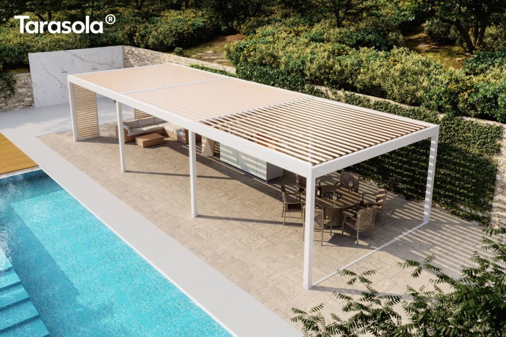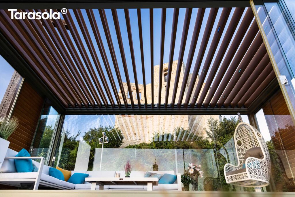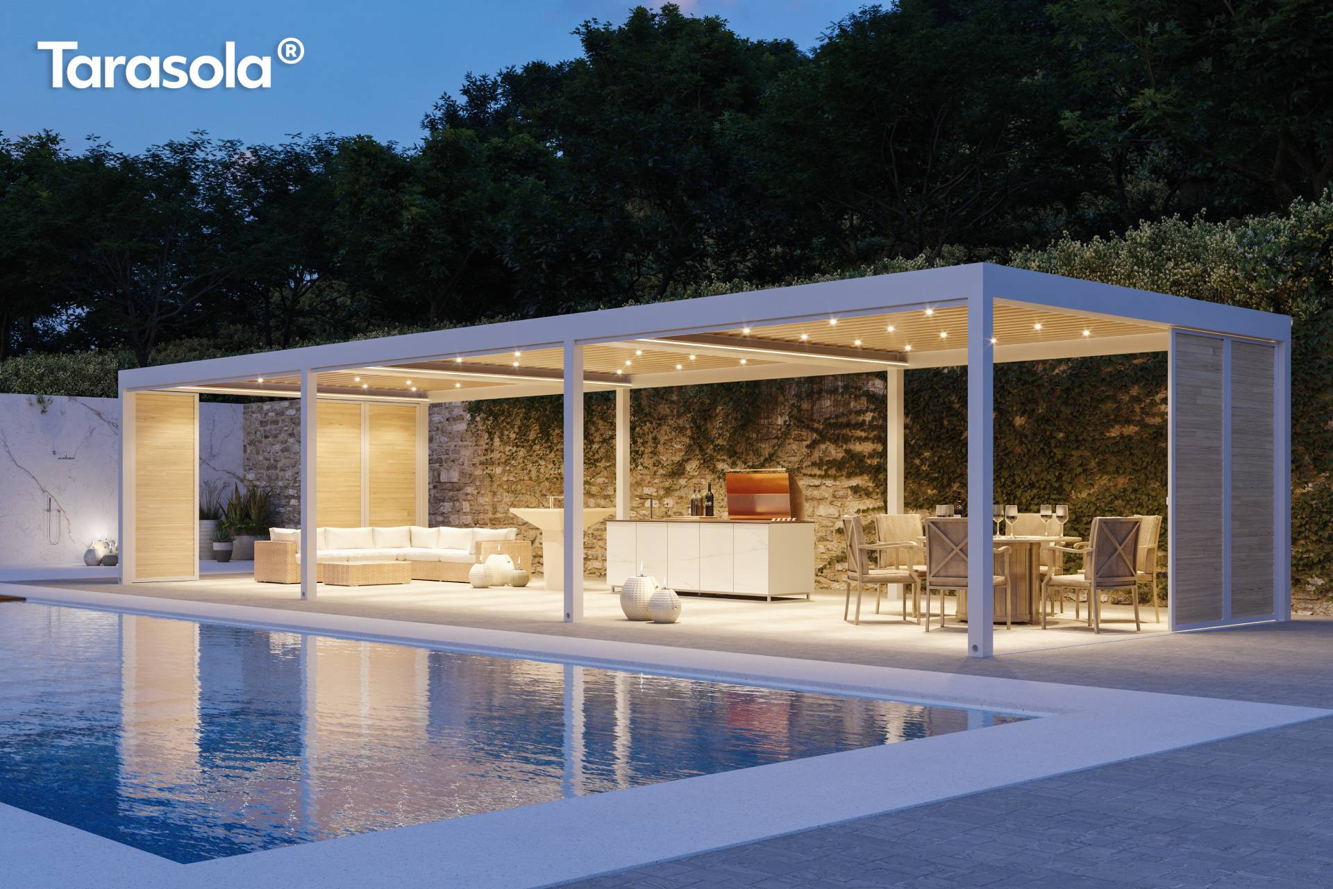 Tarasola Technic Pro wyróżnia się spośród innych modeli zintegrowaną roletą ZIP. Brak dodatkowej kasety na roletę sprawia, że konstrukcja wygląda bardzo elegancko i nowocześnie. Zadaszenie pozwala na regulację nachylenia lameli i dostosowanie do osobistych preferencji. W pozycji zamkniętej dach chroni przed słońcem, deszczem oraz śniegiem, w pozycji otwartej dozuje ilość światła wpadającego na taras oraz zapewnia naturalną wentylację.