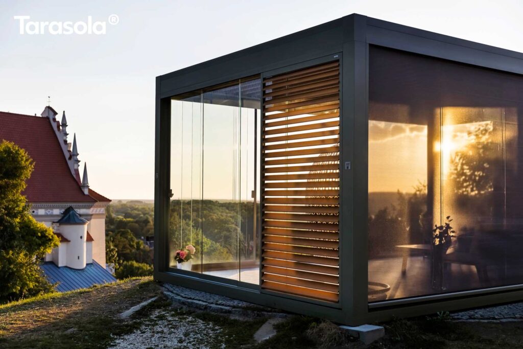 Moduł ze szklanym dachem w zadaszeniu lamelowym